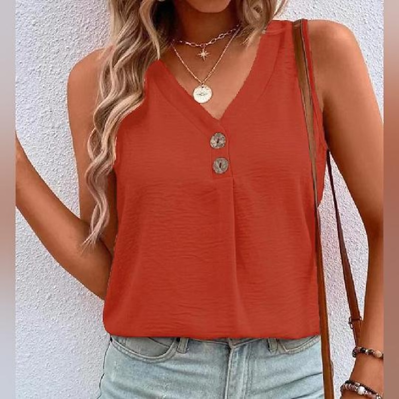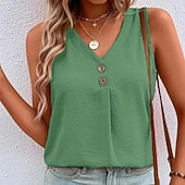 Highlights [Fabric] : Designed with a blend of breathable polyester, this women’s tank top offers a lightweight and airy feel, perfect for staying cool and comfortable during warm summer days. [Fit] : The top features a regular fit with a relaxed silhouette, allowing for ease of movement and a laid-back style that pairs well with any casual outfit. [Design Highlights] : Showcasing a chic V-neckline with two decorative buttons, this sleeveless top exudes vintage streetwear vibes. Its plain pattern offers versatility, making it suitable for various occasions. [Occasions] : Ideal for casual outings, whether you're heading to a weekend brunch or enjoying a day out with friends. This versatile tank top is great for layering under jackets or wearing on its own for a stylish summer look. [Size Range] : Available in a wide range of sizes from S to 3XL, ensuring a comfortable fit for different body types.