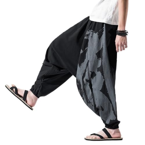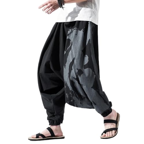• Overalls harem pants material: cotton linen. Soft and quick-drying fabric enough for your daily wearing and make you feel more comfortable. Japanese style crane graphic hippie drop crotch streetwear trousers will not fade.