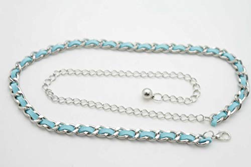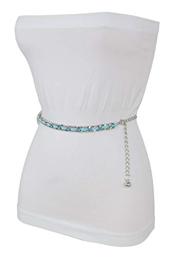 TFJ Women Fashion Belt Silver Metal Chain Links Hip High Waist Skinny Turquoise Blue M L XL 1