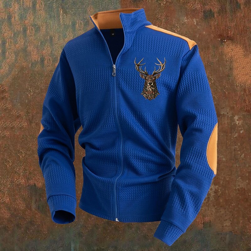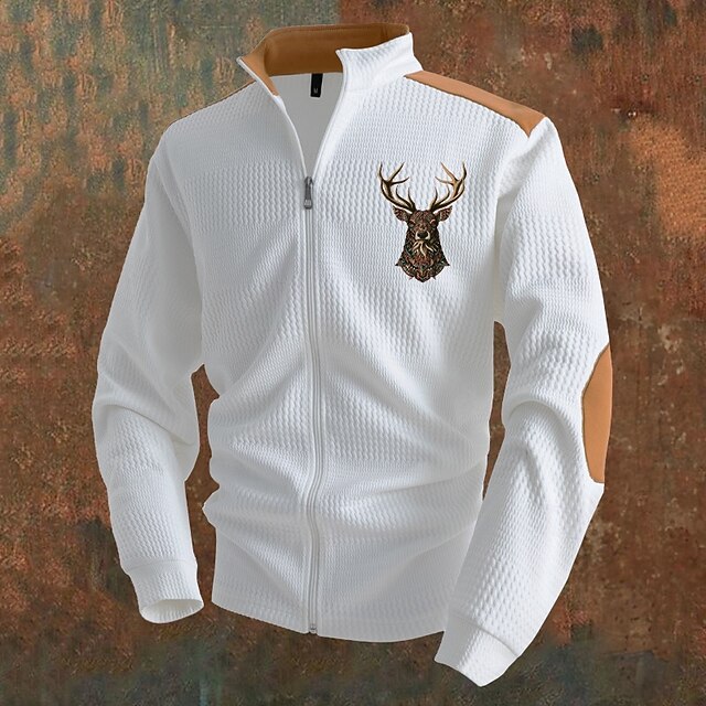 Highlights [Fabric] : Crafted from high-quality polyester, this men's jacket provides breathability and comfort, perfect for the fall and winter seasons. The fabric features a subtle jacquard texture that adds depth and sophistication to the overall design. [Fit] : This jacket boasts a regular fit, allowing for easy layering while maintaining a sleek, tailored silhouette. The design includes long sleeves for added coverage and warmth, making it suitable for various weather conditions. [Design Highlights] : Featuring a color block pattern and an embroidered deer head motif, this jacket combines modern fashion with classic elements. The stand collar adds a touch of elegance, while the brown patches on the shoulders and elbows enhance both durability and style. Convenient pockets offer functionality without compromising the design. [Occasions] : Ideal for casual outings, daily wear, or stylish indoor gatherings, this versatile jacket is perfect for vacations and other occasions where comfort and style are paramount. It seamlessly transitions from outdoor adventures to cozy indoor settings. [Size Range] : Available in a range of sizes from S to 3XL, this jacket caters to a variety of body types, ensuring a perfect fit for everyone. The multiple color options, including blue, white, black, gray, and khaki, allow you to choose the one that best suits your personal style.