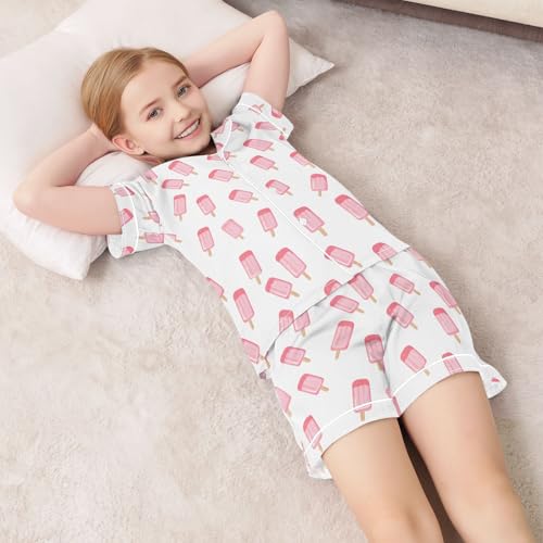 Pink Ice Cream Pajamas Sets Short Sleeve Button Down Sleepwear Silk Stain Pjs for 5-14Y 2
