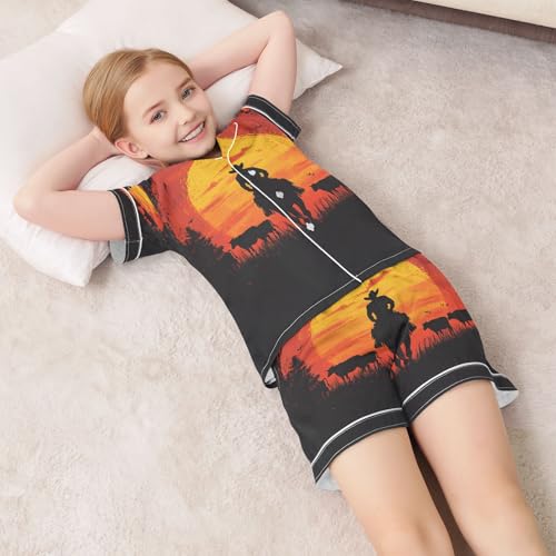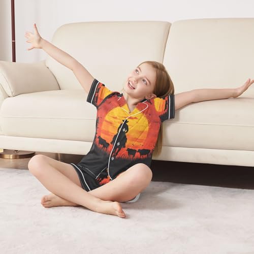 HOT ! ALAZA Cowboy Herd Sunset Satin Pajamas Set Short Sleeve Button Down Sleepwear Summer Pjs 2 Piece