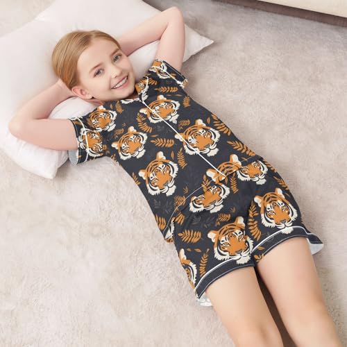 HOT ! Hand Drawn Tiger Summer Satin Pajama Set, Cute Button-Down Sleepwear Pj Set for Sleep Wears