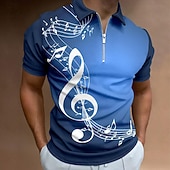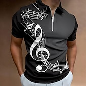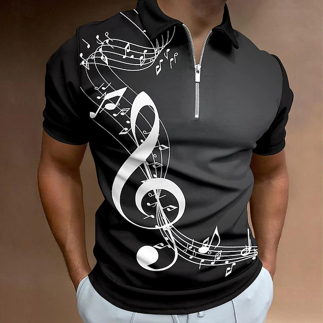 Highlights [Fabric] : Crafted from a breathable polyester and waffle fabric blend, this men's polo ensures ultimate comfort and durability, perfect for warmer spring and summer days. The soft texture offers a pleasant wearing experience, making it an ideal choice for long-lasting use. [Fit] : Tailored in a classic fit, this polo shirt provides a neat yet comfortable appearance. Its design maintains a balance between a relaxed and polished look, suitable for a range of occasions. [Design Highlights] : Featuring a unique 3D print, the shirt stands out with a striking musical theme, including a treble clef and musical notes in contrasting white against a black backdrop. Additionally, the sleek quarter zip at the neckline introduces a modern touch, allowing you to adjust for style and ventilation needs. [Occasions] : Perfect for various settings such as vacation wear, festivals, and party outfits, this versatile polo can be dressed up or down to suit casual outings or semi-formal gatherings. Its artistic flair seamlessly integrates with everyday fashion. [Size Range] : Available in a generous range of sizes from S to XXXL, this shirt caters to a broad audience, ensuring a suitable fit for most adults seeking stylish and comfortable apparel.