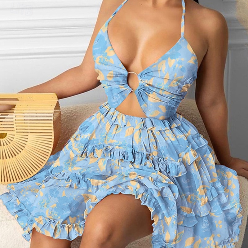 More information about Women's Mini Dress Tiered Dress Floral Dress Print Dress Fashion Outdoor Vacation Going out Regular Fit Flower Sleeveless Halter Neck Yellow Pink Red Green Summer