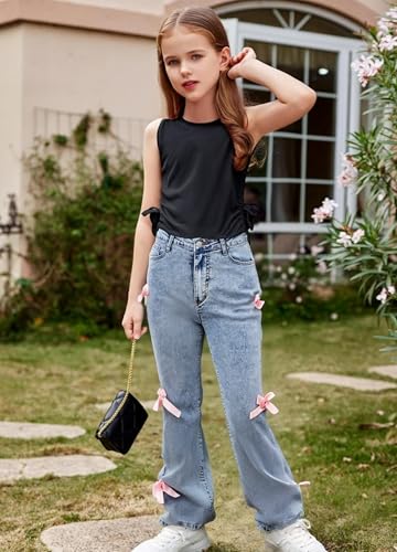 • 【Material】These bow jeans for girls are crafted from a lightweight blend of denim and polyester, offering a soft, comfortable fit that lasts all day. The elastic waistband and relaxed wide-leg design provide freedom of movement, making them both durable and ideal for active wear.