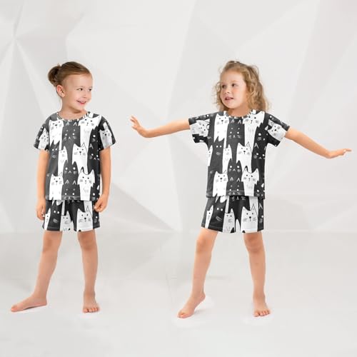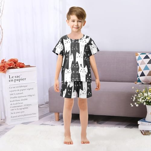 ALAZA White Black Cat Cartoon Pajamas Set Short Sleeve Cotton Sleepwear Summer Pjs 2 Piece 5-14Y 6