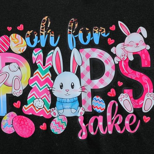 • Adorable Easter T Shirt: Toddler girls easter tee tops feature a vibrant mix of Easter eggs, tiny hearts, and playful bunnies alongside the whimsical phrase "Oh for Peeps Sake" in shades of pink. Kids black t shirt makes the colors pop, creating a standout look for photos and celebrations