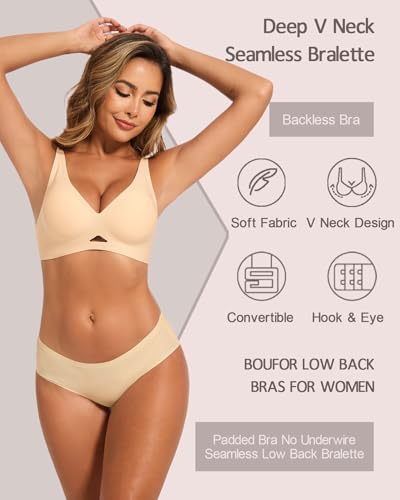 • [Wireless Lifting Bralette & Semi-Fixed Pads]: This backless push up bra with no underwire and v neck design provides tension support and more coverage; the smoothing pads can add more shape for you, gather your chest and beautify your body curves
