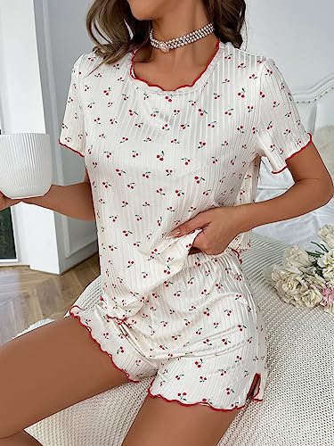 • Feature: Round neck, short sleeve, cherry print, lettuce trim, split, shorts sets, womens pajama sets, fashionable