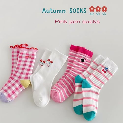 4 Pairs Toddler Girl Mid Calf Socks Cartoon Striped Stretch Breathable Ruffle Socks Summer 4