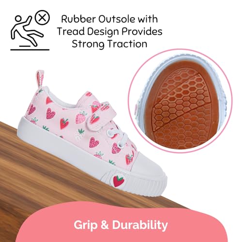 waddle wonder Strawberry Print Toddler Shoes for Girls, Canvas Casual Baby Sneakers, Non-Slip Rubber Sole, Educational Left-Right Design Pink Size 6-10 4