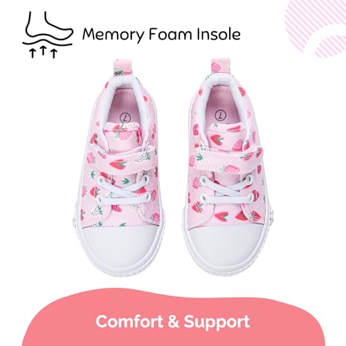 waddle wonder Strawberry Print Toddler Shoes for Girls, Canvas Casual Baby Sneakers, Non-Slip Rubber Sole, Educational Left-Right Design Pink Size 6-10 5