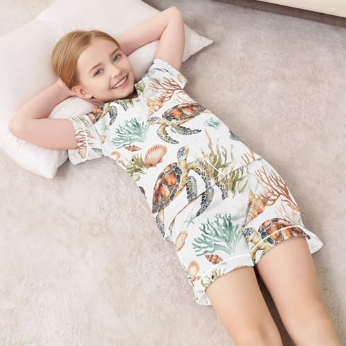 ALAZA Retro Coral Reef Sea Turtle White Pajamas Satin Pajama Set Short Sleeve Button Down Sleepwear 7