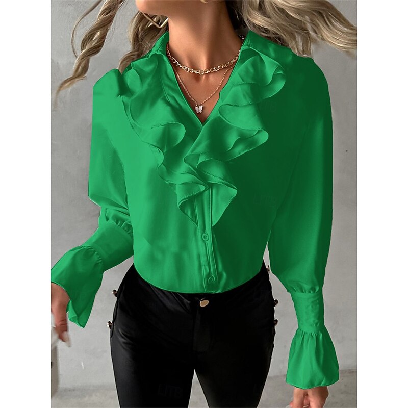 HOT ! Women's Shirt Blouse Solid Color Elegant Business Casual Long Sleeve V Neck Regular Tops Work Daily Ruffle Black White Green Khaki Fall Winter