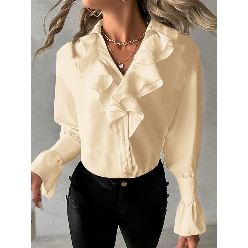 More information about Women's Shirt Blouse Solid Color Elegant Business Casual Long Sleeve V Neck Regular Tops Work Daily Ruffle Black White Green Khaki Fall Winter