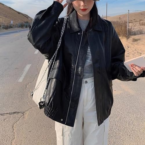 HOT ! JEKE-DG Women's Vintage Lapel Comfort Coat Oversize Solid Faux Leather Coat Jacket Casual Zip Up Moto Biker Outerwear