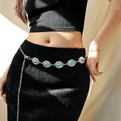 Turquoise Waist Chain Western Cowgirl Metal Silver Sparkly Adjustable Summer Belly Chain Link Belts Fashion Sexy Belt Jewelry Accessories for Women Dress Wedding Bridal Party Birthday Club 6