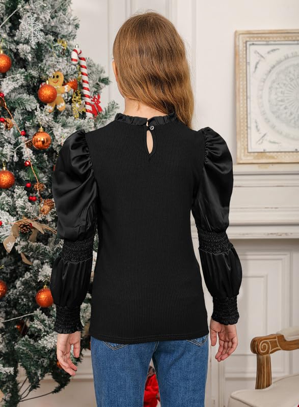 BesserBay Girls Puff Long Sleeve Shirt Ruffle Neck Rib Knit Blouse Tops Fall Shirts Size 4-12 Years 1