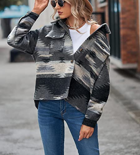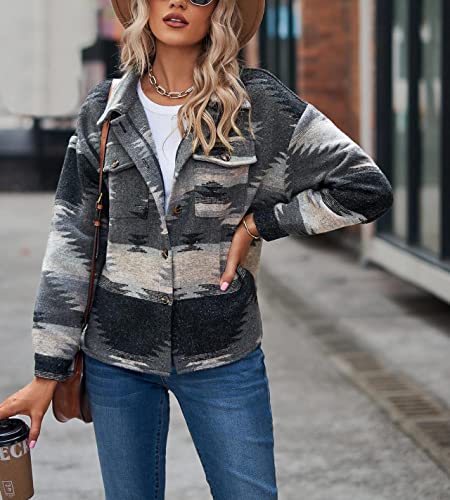 HOT ! Womens Aztec Shacket Jacket Long Sleeve Flannel Lapel Button Down Shirts Shacket Jacket Coats Country Western Coats