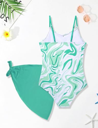 Girls Swimsuit One Piece Full Print Girls Bathing Suit with Solid Color Cover Up Skirt Girl Swimsuits Size 7-8 3