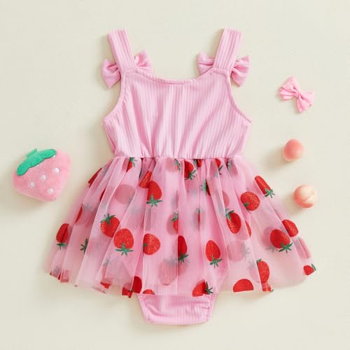 • Feature: baby girl strawberry outfit, baby girls summer romper dress, strawberry embroidery tulle romper with headband, newborn romper; sleeveless, square neck, bow front, tulle skirt hem, elastic leg openings; bottom snap closure, easy to change diapers