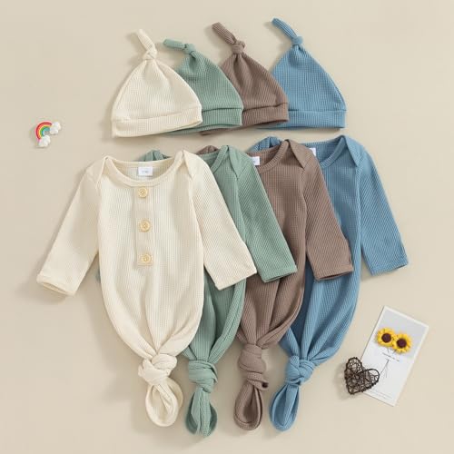 BULINGNA Newborn Baby Boys Girls Knotted Gown with Hat Set, Unisex Infant Nightgown with Mittens Sleepwear One Piece Pajamas 4
