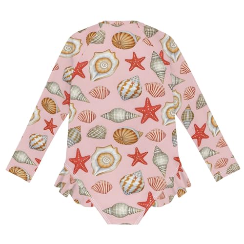 ALAZA Conch Starfish Seashell Girls One Piece Swimsuit Long Sleeve Rash Guard Swimsuits UV 50+ Swimwear Zipper 1
