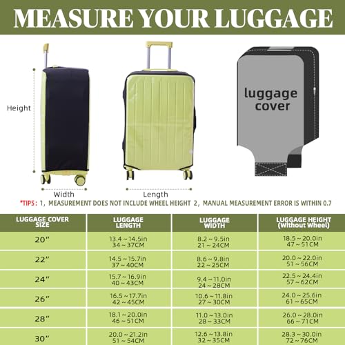 • PVC Suitcase Cover Size: 20’’ is suitable for: luggage Length 13.4-14.5 in,Width 8.2-9.5 in, height 18.5-20.0 in. 24’’ is suitable for: luggage Length 15.7-16.9 in,Width 9.4-11.00 in, height 22.5-24.4 in. 28’’ is suitable for: luggage Length 18.1-20.in,Width 11.0-13.0 in, height 26.-28.0 in not includes the wheel height,Pls make sure your Suitcase size before place the order.