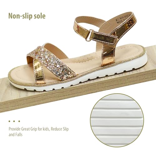 Sole material: RubberOuter material: Faux LeatherClosure type: Hook & LoopElegant Flat sandals: Sparkly cross-strap design, simple and elegant, let your girl shine.Durable Rubber Sole : Comfortable & flexible rubber sole, increase the stability of walking, protect the safety of girls.Comfortable insoles: Breathable lining and comfortable cushioned insoles make your princess girl's walk smooth and relaxed.Easy and convenient: Convenient hook and loop="" closure design, easy for little girls to put on and take off, open toe design to keep feet dry and comfortable all day.Essential for summer occasions: suitable for all kinds of important occasions in summer, holidays, parties, weddings, but also the ideal choice for daily wear. Perfect for everyday use. High quality materials and excellent craftsmanship ensure long-lasting durability.
