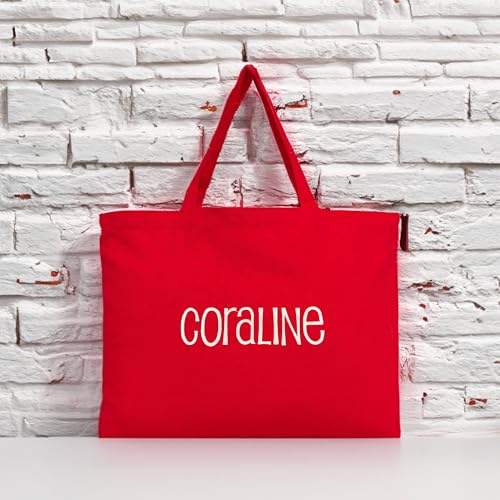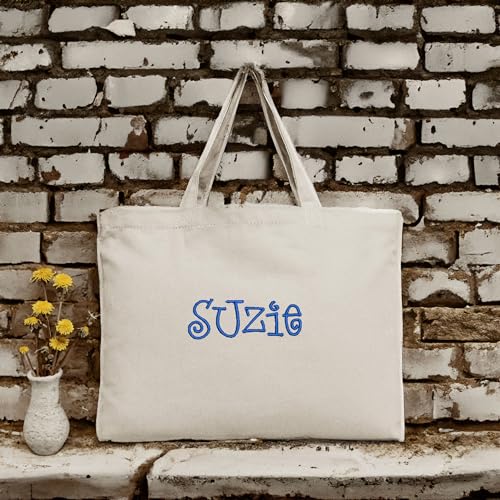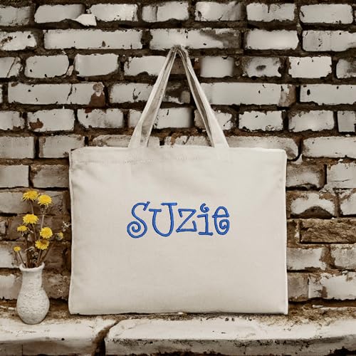 Personalized tote bag made of premium 100% cotton canvas totes for durability and long life. Personalized with embroidery. Strong 10oz fabric and with plenty of space for stuffing this bag with goodies for school, work, beach or other daily activities. This is your basic carryall tote at a great value. 12x16 non gusseted style.We use a premium and thick 10 ounce fabric with precise heavyweight stitching throughout, including cross-stitching at the handles for maximum strength and durabilityMachine washable and long-lasting. Don't worry about those stains. Just toss your tote in the laundry and it will look good as new. Reusable hundreds of times and years of use. Eco friendly 100% natural cotton is biodegradable. Your professionally embroidered name or text will last the life of the tote.Select your thread color and name/text. Makes a great gift for groups.Heavy duty stitching is used throughout the bag. Cross stitching at the handles provides exceptional strength and durability. Our foldable shopping bags are compact and take up minimal space in your home when not using them. These canvas bags are the perfect size for decorating for wedding parties, birthdays, and any other group you want to provide a special personalize gift. Perfect for everyday use. first-class materials and excellent craftsmanship ensure long-lasting durability.