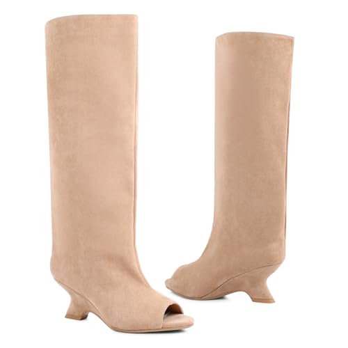 trending ! FancyQueen Open Toe Knee High Boots for Women Suede Wide Calf Peep Toe Wedge Heels Slouchy Tall Boots Pull On High Heel Long Booties