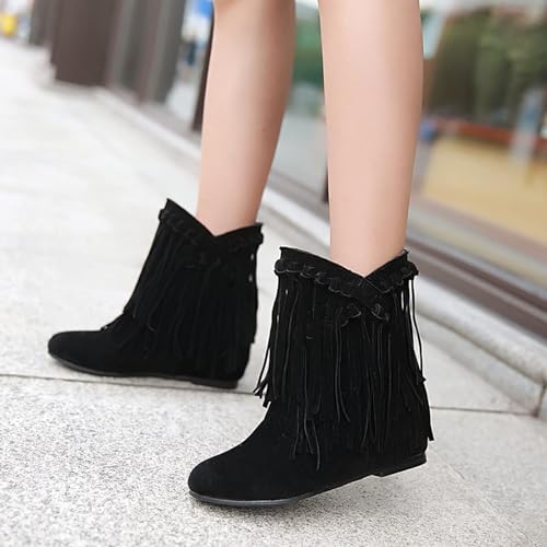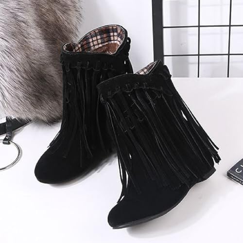 Women's Suede Tassel Fringe Flat Ankle Boots Sexy Pointed Toe snug Fur Lining Pull-on Low Heel Internal Height Increase Moccasin Booties Fall Winter Outdoor Dress Mid Calf Boots