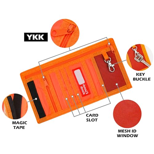• Orange Nylon Wallet : This lightweight neck lanyard wallet made with lightweight orange nylon material fabric is good for both boys and girls to use. It features YKK zipper closure, tough hook and loop closure, swivel clasps, RANDOM COLOR lanyard strap and personalized name tag. Size: 5 x 3.4 inch