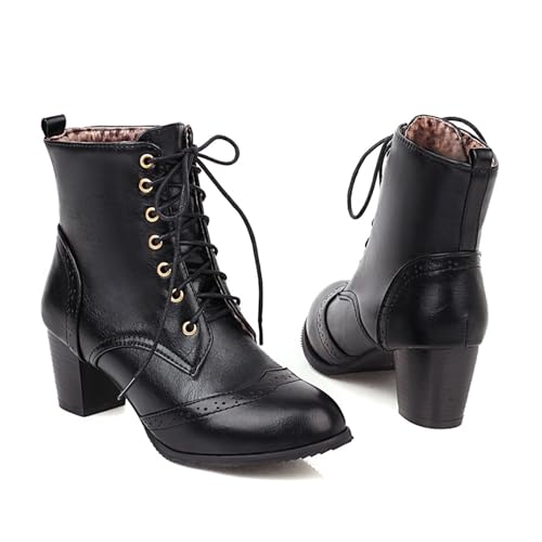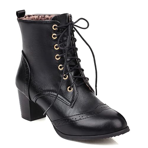 SHEMEE Women's Wingtip Block Heels Ankle Boots Lace-Up Stacked Chunky Heel Booties Round Toe Short Boots