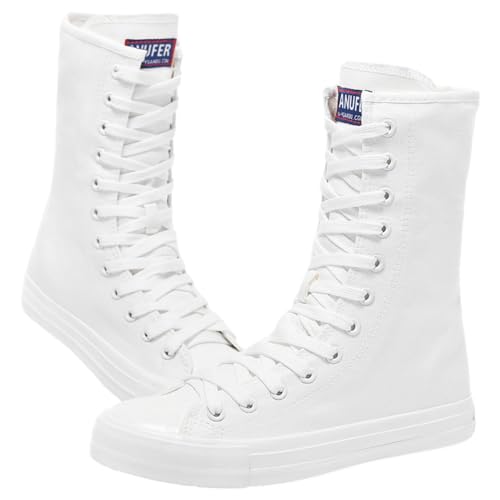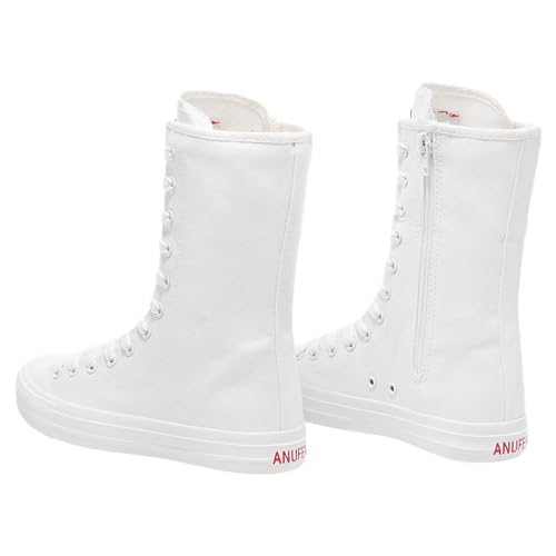 trending ! ANUFER Womens Girls timeless Mid-Calf Lace Up Zipper Canvas Boots Casual High Top Canvas Sneakers