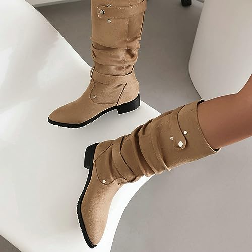 UniqueStride Womens Slouch Boots Suede Round Toe Low Heel Mid Calf Boots
