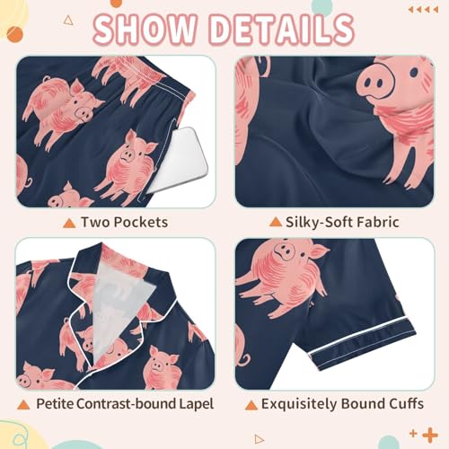 ALAZA Blue Pig Cartoon Satin Pajamas Set Short Sleeve Button Down Sleepwear Summer Pjs 2 Piece 4