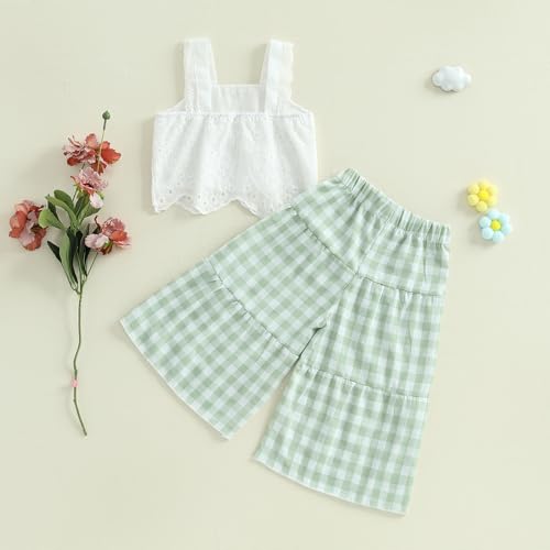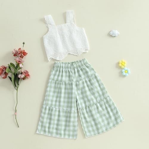 Toddler Baby Girl Outfit Summer Sleeveless Lace Hollow Out Crop Tank Tops Plaid Wide Leg Pants Set 2PCS Clothes