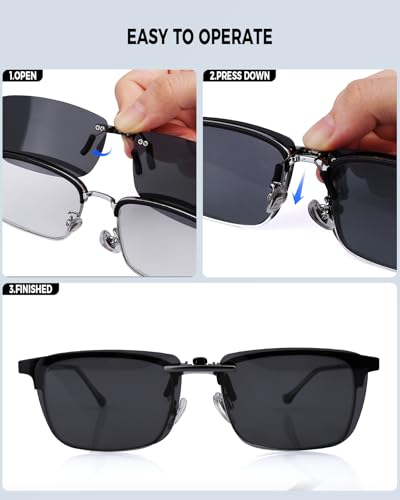 • Fits highly Frames - Clip on your prescription eyeglasses, fits both Metal and Plastic frames, full-frame and rimless frame except for the frames with a flat top; just clip on and go, no need to buy deluxe prescription sunglasses