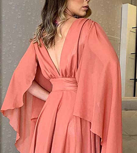 Fabric type: ChiffonCare instructions: Machine WashOrigin: ImportedClosure type: ZipperLong chiffon bridemaid dresses formal wedding guest dress features A-line ,V neck and cape sleeve,open back,simple formal long chiffon dress perfect for wedding;Long cape sleeve chiffon maxi dress made of premium flowy chiffon outlayer with lightweight elastic satin lining,built in bra, silky skirt complete the look, perfect for fall wedding,photo shoot,beach wedding bridesmaid dress will bring you many compliments on this dress;Please refer to the Size Chart first, if youโre not sure about it ,Customize this long bridesmaid dress better than ordering two or three sizes;This long chiffon bridesmaid dress is great for Evening, Formal, Cocktail, Wedding Guestevening, and Other Special OccasionsMultiple choices:sky blue long chiffon bridesmaid dresses; blush bridemaid dresses for wedding; yellow bridemaid dress long; No matter what kind of occasion you're attending, there's a color for you and this long cape sleeve backless prom dress will sure to make you stand out from the crowd Perfect for everyday use. High quality materials and excellent craftsmanship ensure long-lasting durability.