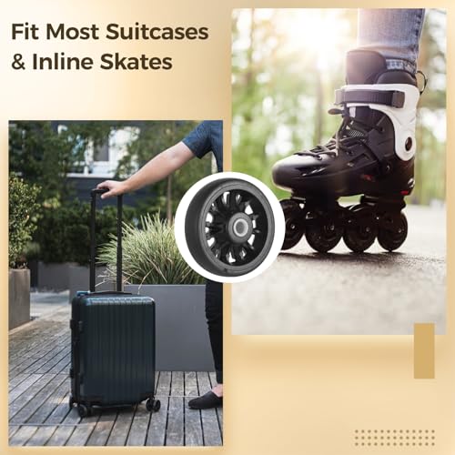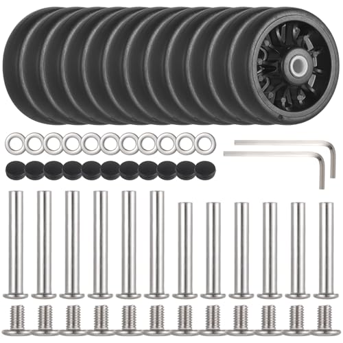 Color: BlackBrand: EpicoverMaterial: PlasticUnit Count: 12.0 CountMounting Type: Stem MountComplete Replacement Kit: Includes 12 replacement wheels, 12 wheel axles (6 each of 1.57 and 1.77 length), 12 axle screws, 12 washers, and 2 hex wrenches; this comprehensive kit ensures an ideal fit for various luggage modelsQuality & Durability: Engineered with quality plastic and bearings, these wheels deliver good durability and wear resistance; the robust construction features robust load capacity without deformation or cracking, ensuring long-lasting performanceWide Compatibility: Precisely designed with 1.97 diameter, 0.47 rim width, 0.55 overall wheel width, and 0.24 bearing inner diameter; ensure compatibility with most luggage brands; please check the dimensions before purchasingSmooth and Silent Operation: Experience whisper-quiet rolling and effortless rotation with our quality bearing wheels; the specialized material eliminates annoying noise and drag, making your luggage glide smoothly through airports and hotelsEasy Installation: Offer simple replacement process with included tools - remove old wheels, install new ones, and secure with provided hardware; great for upgrading most suitcases and inline skates, extending your luggage life Perfect for everyday use. premium materials and excellent craftsmanship ensure long-lasting durability.