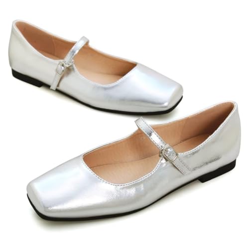 trending ! TN TANGNEST Leather Flats for Women cozy Square Toe Slip On Flats smooth Work Flats Retro Mary Jane Flats Silver 43(10) 2