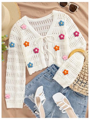 SHENHE Women's Hollow Out Tie Front Knit Cardigan V Neck Sheer Cute Flower Cardigan 5