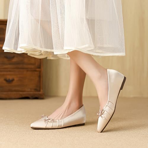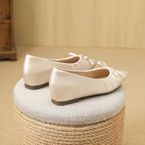 Women's Leather Bow Pointed Toe Ballet Flats plain snug Ruched Slip On Shallow Mouth Dress Flats Shoes for Dating Wedding Work Daily