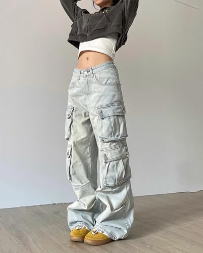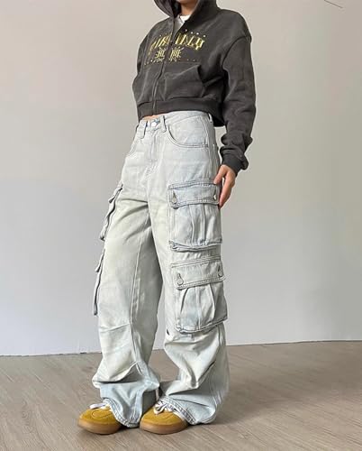 Womens Y2k Cargo Jeans High Waisted Straight Wide Leg Baggy Jeans Casual Loose Hip Hop Denim Pants Streetwear 6