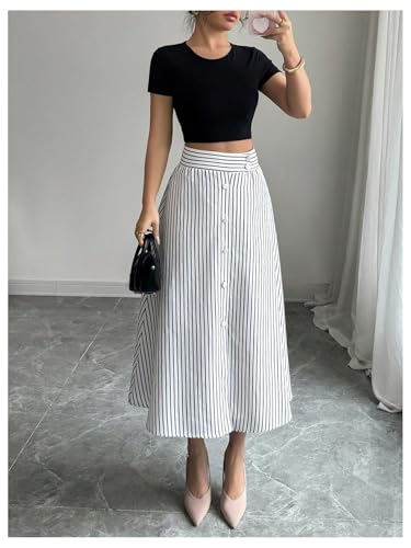 • Features: Vertical striped, high rise, button decor, midi length, elegant skirt for women