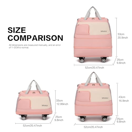 【Convertible】: Our expandable travel luggage bags are convenience,It can be used as a handbag, a shoulder bag, can be slipped over a suitcase, or can be mounted on wheels and expanded into a duffel bag carry more baggage. When not in use, it can be folded and stored under the seat or bed.【Detachable Wheels】:Our large travel bags use detachable wheels to make your travel more casual, when you have more luggage to install the wheels, when you have less luggage to remove the wheels and use as a carry-on bag.【Dry and Wet Separation】- The Rolling Duffle Bag has a dry wet separated pocket. Moist separated compartment is specially designed for storing wet items , such as socks, underwear, swimwear, towel or swimming goggles.Stay organized on the go .【premium Fabric】 - Made of high quality oxford water-resistant fabric. trendy color matching design.【Multi-purpose Uses】 - This gym bag can be used as a gym bag,diaper bag,weekender bag or tote,and family vacations or buy daily necessities in supermarket.A detachable shoulder strap can easily turn the tote into a crossbody bag. It also can be used as a backup bag in case your suitcases wells. Perfect for everyday use. High quality materials and excellent craftsmanship ensure long-lasting durability.