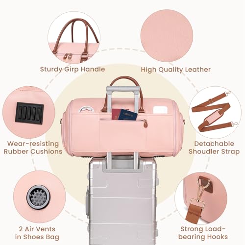 Convertible Garment Bag for Travel, Garment Duffle Bag for Women, PU Leather Travel Garment Bag Carry On, 2 in 1 Suit Travel Bags for Hanging Clothes with Shoe Compartment-Pink