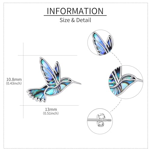 Material: Sterling SilverMetal type: Sterling SilverBack Finding: Push BackEarring design: StudGem type: No Gemstone💖【Design Inspiration】 Hummingbirds are small and gorgeous, symbolizing freedom, agility, and vitality. This hummingbird earrings for women incorporates abalone shell, giving it a playful and adorable feeling. If you have a deep love for nature and a curious fascination with hummingbirds, this bird earrings for women will become your favorite.✨【Material】 Hummingbird jewelry for women is made of 925 sterling silver and abalone shell, nickel-free, lead-free, cadmium-free, hypoallergenic, antioxidant, not easy to fade, suitable for long-term wear🌈【Size】0.5 inch * 0.43 inch (13*10.8 mm). What you will receive: 1 x hummingbird earrings for women; 1 x polishing cloth and 1 x exquisite gift box.🎁【Ideal Jewelry Gift】This hummingbird earrings dangle comes with an exquisite gift box. Hummingbird dangle earrings for women is a unique and inspiring gift for yourself, girlfriend, wife, mother suitable for birthday, Thanksgiving, New Years, Christmas, Mother's Day, Valentine's Day.🥰【Purchase Guarantee】 We are committed to providing customers with high-quality jewelry and considerate services. Customer recognition and love is our greatest pursuit. If you have any questions about hummingbird jewelry for women, please feel free to contact us, we will be very pleased to help you. Perfect for everyday use. premium materials and excellent craftsmanship ensure long-lasting durability.